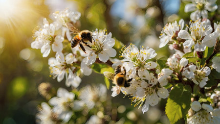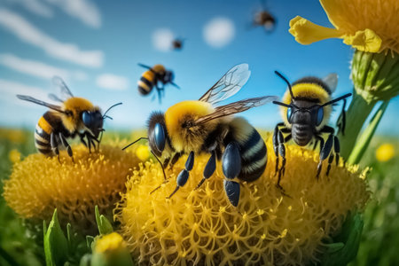 Bees pollinating yellow flowers in lush garden with beautiful blurred background