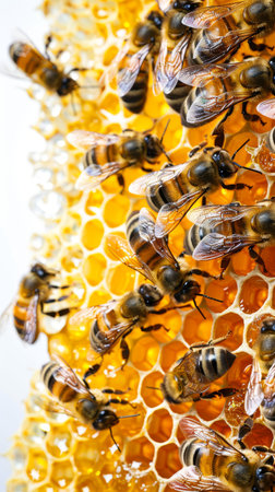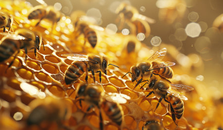 Discover the intricate world of bees as they work diligently on honey cells within their hive. This close-up view captures their essential role in pollination and ecosystem health.