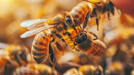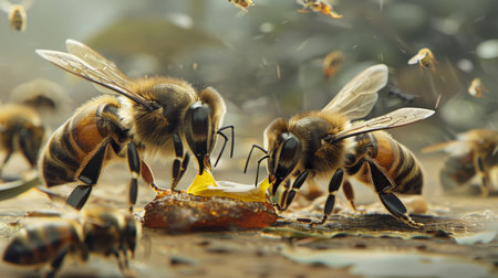 Close-up of bees gathering honey from honeycomb, highlighting their busy activity and intricate details.