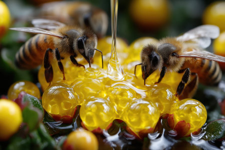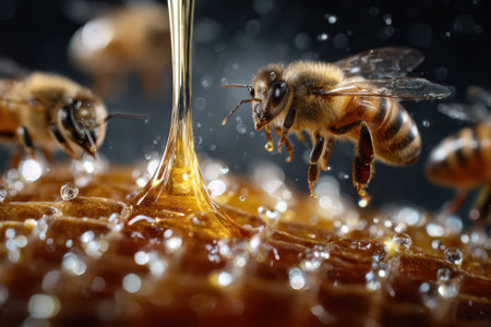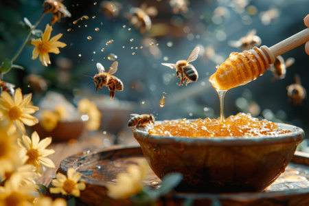 Flying bees over a honey bowl with flowers. Bees buzz vividly around a bowl of honey amid a garden full of yellow flowers, accented by splashing honey.