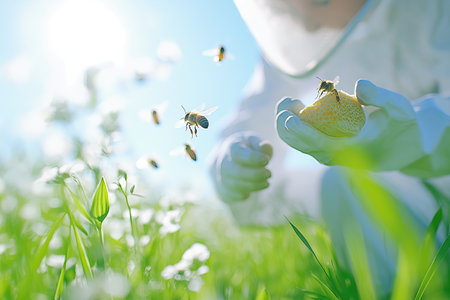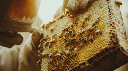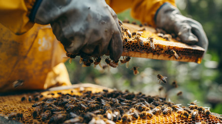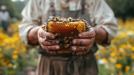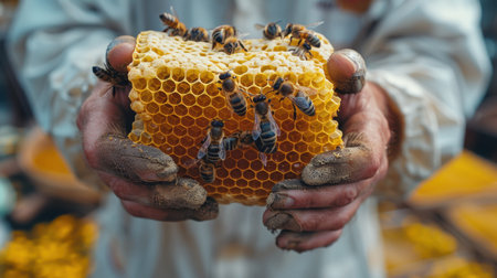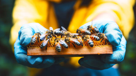 A captivating close-up of a beekeeper handling honeycomb with bees, showcasing the beauty of nature, pollination, and sustainable agriculture practices.