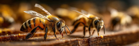 Close-Up of Honey Bees on Wooden Hive Frame .Generative AI