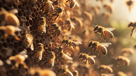 Worker bees gather nectar and create honey inside a busy hive under bright sunlight, showcasing their essential role in nature.