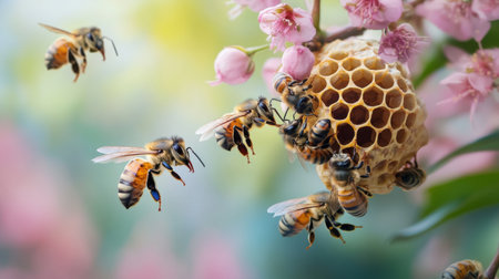 Bees creating a nest on a flower branch, with some bees working on the hive and others collecting pollen.