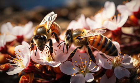 close-up of a honey bee in the process of collecting honey on a flower and on a honeycomb