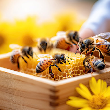 Bees actively gather nectar from the honeycomb surrounded by bright yellow flowers in a sunny garden.
