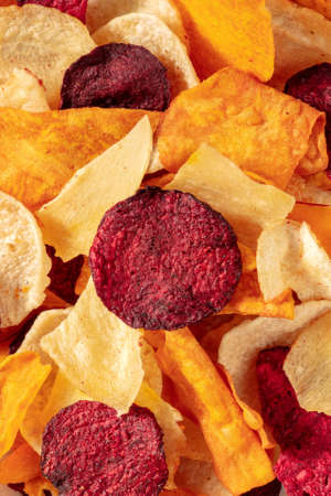 Healthy colorful vegetable chips made of potato, beet and turnip close up. Trend of healthy crispy snacks.