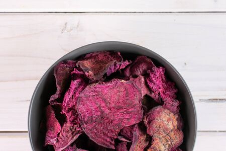 Purple Baked Beet Chips on white wooden surface. Organic Appetizer