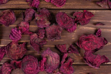 Wooden table with Beetroot Chips (detailed close-up shot; selective focus)