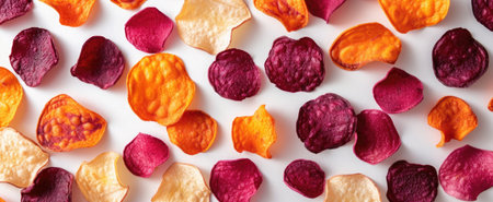 Homemade vegetable chips made from organic potatoes, beets, and carrots in a white background. Vegetarian theme banner.