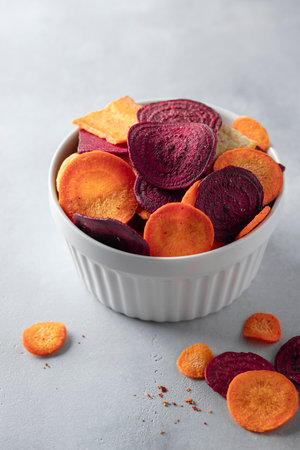 Healthy balanced food, clean eating, naturally flavoured snacks, transparent ingredients concept. Dried vegetables, dehydrated sweet potato, parsnip, beetroot chips on a white background