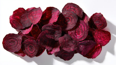 Dried beet slices. Dehydrated vegetables, dried beetroot chips isolated on white background. Healthy vegan snacks.