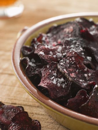 A small terracotta bowl filled with salted red beet chips atop a wood table.