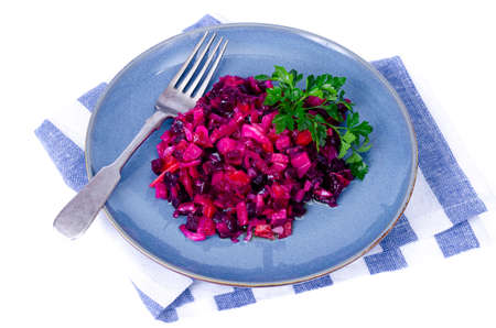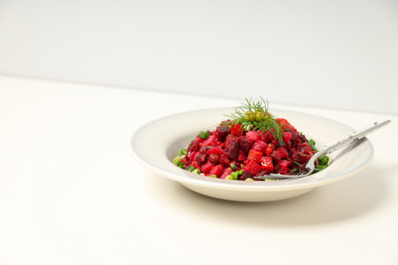 Vinaigrette on a white background. Traditional Russian vegetable salad with red beets on a plate. Vegetarian dish on a yellow napkin.