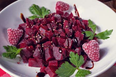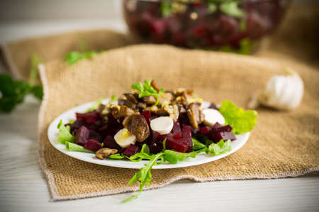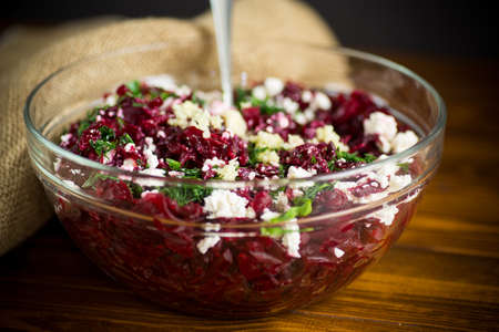 dietary salad of boiled beets with walnuts and cottage cheese on a wooden table