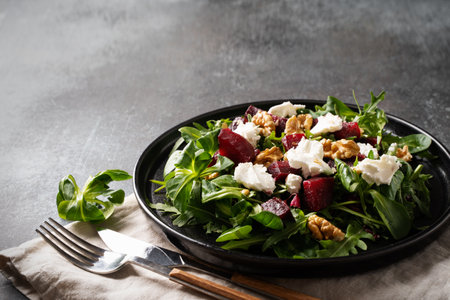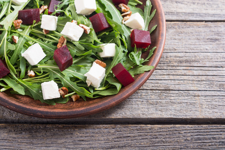 Close-up of arugula and beetroot salad with walnuts and feta cheese