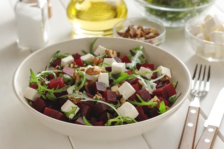 Bowl of beetroot feta salad for healthy diet on whit wooden table. Vegetarian dish with beet, cheese, walnut and arugula.