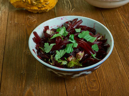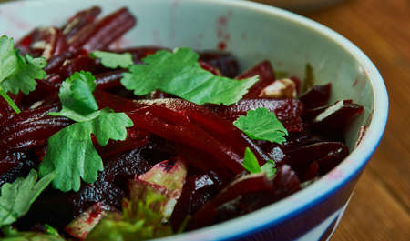 Vegan beet salad. Marinated sliced beetroot with fresh cucumber, walnuts, and coriander leaves in ceramic bowl. Food background. Healthy, plant-based dish. Top view, close up