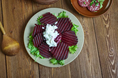 Vegetable salad made from beets, peppers, olives and cheese.Copy space