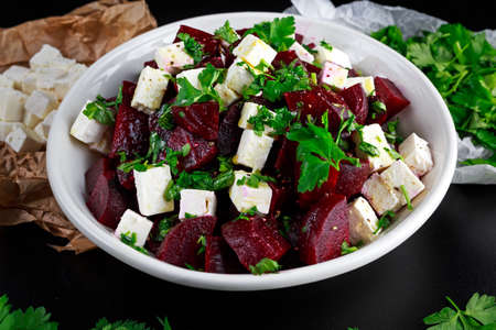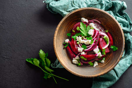 Beetroot salad with feta cheese and parsley, view from above, space for a text