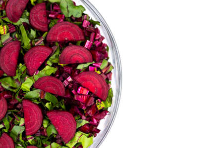 Fresh, cut leaves and beetroot pieces arranged in a glass bowl. Photo taken under artificial, soft light. Object isolated on white background