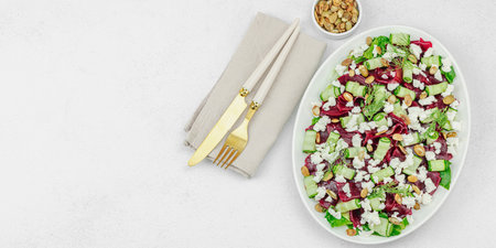 Fermented beetroot salad with cucumber, dill, pumpkin seeds, and feta cheese. A healthy winter meal, probiotic food, clean eating and a balanced diet. Light natural background, banner format