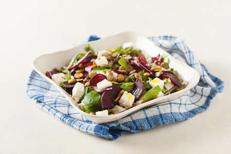 Top view on healthy vitamin salad with beetroot cheese and greens