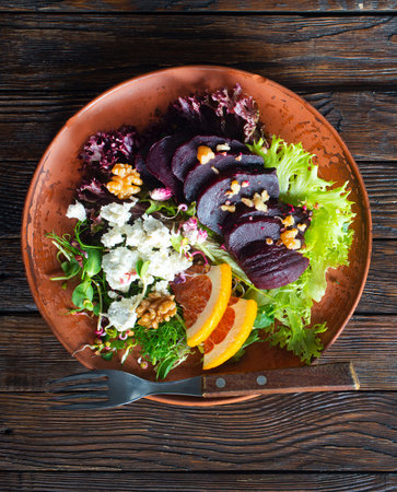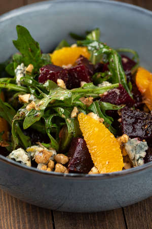Healthy beet salad with arugula, oranges and walnuts. Clean eating, dieting, vegan food concept. Food recipe background. close up.