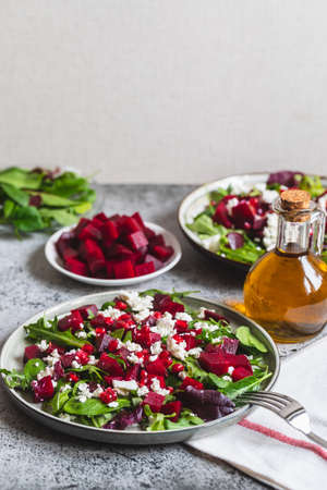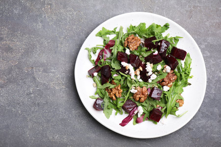 Arugula, Beet and cheese salad with pomegranate and dressing on plate on gray stone kitchen table background, place for text, top view
