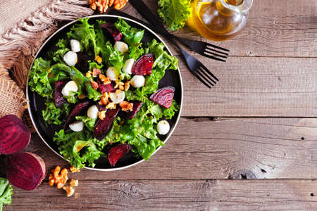 Healthy kale and beet salad with cheese and walnuts. Overhead view table scene on a rustic wood background with copy space.