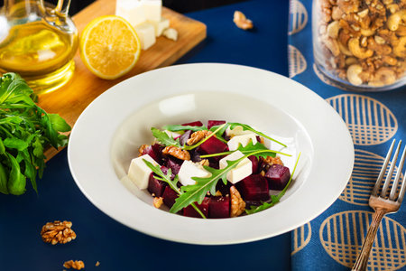Simple, healthy, beetroot fitness salad. Beetroot, Feta Cheese, Arugula, Walnuts, Olive Oil. blue background food photo