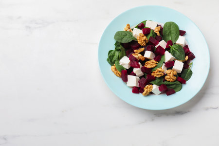 Delicious salad with beetroot, feta cheese, spinach and walnuts on white table, top view. Space for text