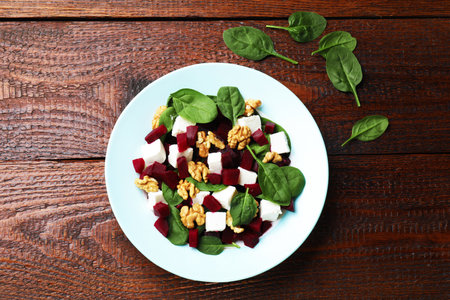 Delicious salad with beetroot, feta cheese, spinach and walnuts on wooden table, top view