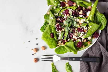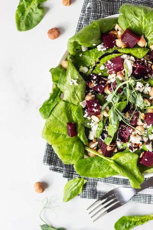 Beetroot, spinach, chickpea, feta cheese and hazelnut salad decorated with sprouts on light kitchen table. Copy space for text.