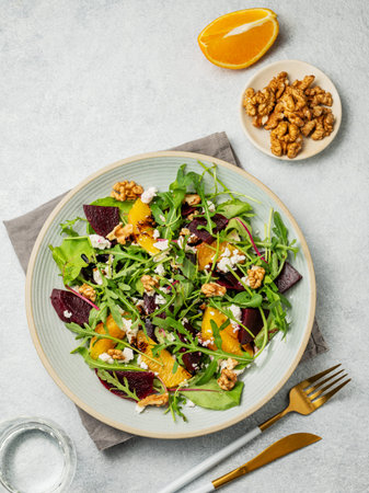 A fresh salad of beets, orange, and arugula with feta, walnuts, and balsamic dressing on a plate on a light background with cutlery, nuts and a glass of water. Healthy organic food concept. Top view, copy space.