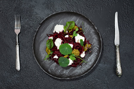 Beetroot salad with ricotta, microgreen and pesto sauce in a black plate