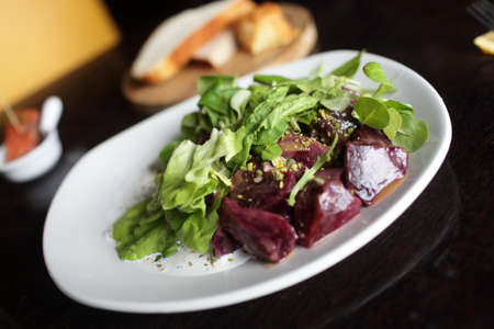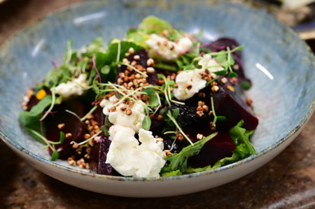 Vegetable salad of fresh beets, arugula, cottage cheese, pine nuts