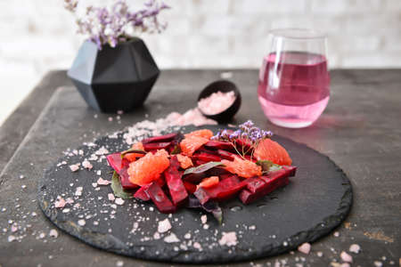 Baked beet salad with citrus fruits and stracciatella on restaurant plate isolated. Red salat with sliced beets, grapefruit, pomegranate, cheese ice cream closeup