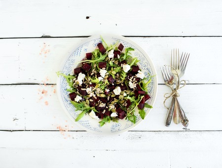 Beetroot salad with arugula, feta cheese and pumpkin seeds in vintage plate over white rustic wooden background, top view,