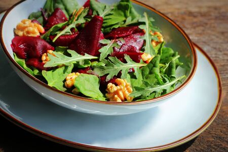 Healthy Beet Salad with fresh sweet baby spinach, arugula, nuts on wooden background