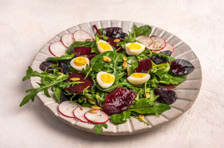Close up homemade salad of quail eggs, boiled beetroot, radish, arugula and basil with olive oil on a light background, copy space