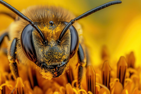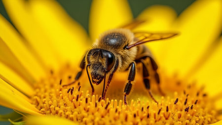 A stunning macro photograph captures the intricate details of a golden honeybee diligently at work. With its proboscis extended, it gathers sweet nectar from a vibrant yellow flower, showcasing the essential and delicate process of pollination vital to our ecosystem.