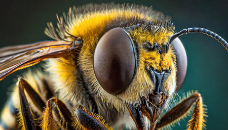 A detailed close-up of a honey bee, showcasing its intricate wings, eyes, and fuzzy body. Perfect for nature enthusiasts and bee lovers.