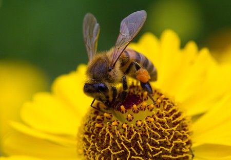 A detailed view of a honeybee interacting with a vibrant yellow surface, showing its unique features.