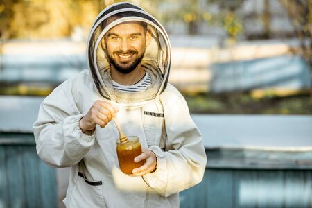 Portrait of a handsome beekeper in protective uniform standing with honey, tasting fresh product on the apiary outdoors