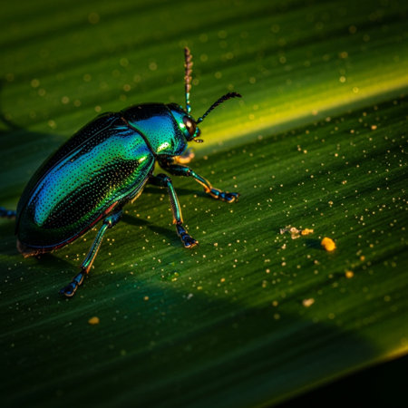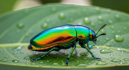 An exquisite close-up of a colorful beetle perched on a leaf, adorned with droplets of water, emphasizing nature's beauty and intricate details in a tranquil setting.
