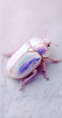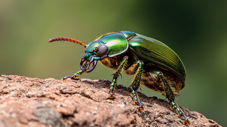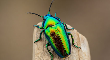 An iridescent beetle displays a vibrant array of colors across its shell, set against a soft, out-of-focus backdrop. The close-up shot highlights the insect's detailed legs and antennae. Suitable for scientific illustrations, nature articles, or designs related to biodiversity, this image captures the beauty of nature.