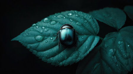 A striking close-up of a dark beetle resting on a leaf adorned with water droplets. This macro photography captures intricate details of nature and wildlife.