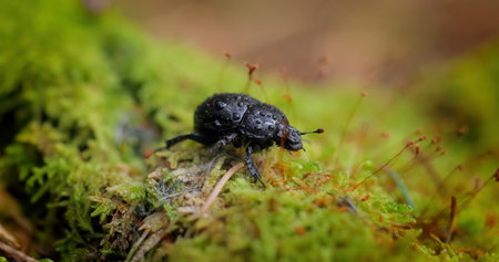 Beetle crawling on a mossy forest floor