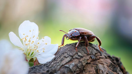A small beetle with a dark brown shell and visible legs is perched on a textured tree trunk, with a soft focus on its intricate details.